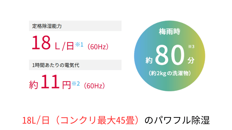 - 湿度をデジタル表示:目標の湿度までしっかり下がっているか、数値でパッと確認できる親切設計。