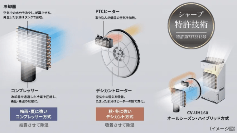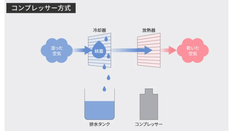 - 【メリット】 ヒーターを使わないため室温が上がりにくく、梅雨〜夏にかけての除湿に強い